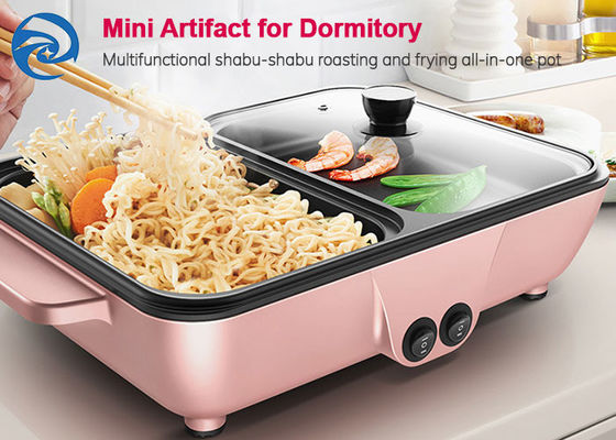 Elektrischer bratener Maschinentopf des Haushaltsmultifunktionsgrills. Die fünf Funktionen des Bratens, der Röstung, des Kochens, des Bratens und des shabu werden in einem, mit einem doppelten Bratblechentwurf, mit shabu auf dem links und Braten auf dem Recht kombiniert.